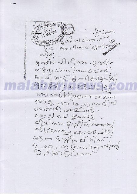 തേഞ്ഞിപ്പലം: കാലിക്കറ്റ് സര്വകലാശാല വൈസ്ചാന്സലര് ഡോ. അബ്ദുള് സലാമിന് വധഭീഷണി. ഇന്നത്തെ സര്വകലാശാല തപാലിലാണ് വിസിയെ 11 ദിവസത്തിനകം കൊല്ലുമെന്ന് ഭീഷണിപ്പെടുത്തിക്കൊണ്ടുള്ള കത്ത് ലഭിച്ചത്. മലയാളത്തില് കൈപ്പടയിലാണ് കത്തെഴുതിയിരിക്കുന്നത്.