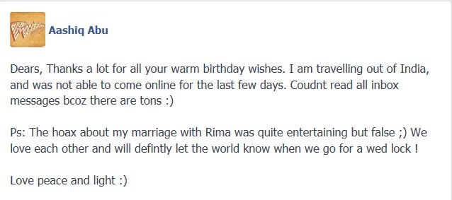 ഏതായാലും ആഷിഖ് തുറന്നുപറഞ്ഞിരിക്കുന്നു തങ്ങള്‍ ഇതുവരെ വിവാഹിതരായിട്ടില്ലെന്നും പക്ഷെ എല്ലാവരെയും അറിയിച്ചുമാത്രമെ വിവാഹമുണ്ടാകു എന്നും . വാര്‍ത്തകള്‍ പ്രചരിക്കുമ്പോള്‍ താന്‍ വിദേശത്തായിരുന്നെന്നും അതുകൊണ്ട് കുറച്ച് ദിവസങ്ങളായി ഓണ്‍ലൈനില്‍ വരാതിരുന്നതെന്നും ആഷിഖ് പറഞ്ഞു. ഫേസ്ബുക്ക് വാളിലെ കുറിപ്പ് ആഷിഖ് അവസാനിപ്പിക്കുന്നത് എല്ലാവര്‍ക്കും സ്‌നേഹവും ശാന്തിയും വെളിച്ചവും ആശംസിച്ച്‌കൊണ്ടാണ്.