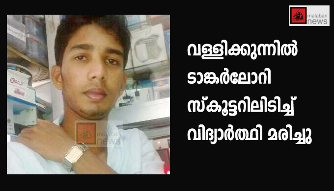 വള്ളിക്കുന്ന് ::ടാങ്കര്ലോറി സ്കൂട്ടറിലിടിച്ച് വിദ്യാര്ത്ഥി മരിച്ചു. ഒലിപ്രം മൈലാഞ്ചി വളവിലെ കണ്ണിക്കുളങ്ങര പടിഞ്ഞാറയില് അഷറഫിന്റെ മകന് ഫവാസ്(17) ആണ് മരിച്ചത്. ഇന്ന് വൈകീട്ട് നാലു മണിയോടെ വള്ളിക്കുന്ന് അത്താണിക്കലിനടുത്ത് കച്ചേരിക്കുന്ന് വളവിലാണ് അപകടം നടന്നത്.