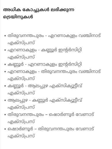 ആറ് ട്രെയിനുകളില് തിങ്കളാഴ്ച മുതല് അധിക കോച്ചുകള് ലഭ്യമാകും. അധികമായി അനുവദിച്ചത് സെക്കന്റ് ക്ലാസ് ജനറല് കോച്ചുകളാണ്. എല്ലാ ട്രെയിനുകളിലും ഓരോ കോച്ച് വീതമാണ് അനുവദിച്ചിരിക്കുന്നത്.
