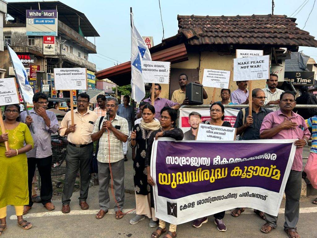 പരപ്പനങ്ങാടി: യുദ്ധത്തിനെതിരെ ഒന്നിച്ചണിനിരക്കണമെന്നും ലോക സാമ്രാജ്യത്വത്തിൻ്റെ കച്ചവട താല്പര്യങ്ങൾക്കനുസരിച്ച് ആഗോളയുദ്ധങ്ങൾ ഉണ്ടാക്കുന്നത് അനുവദിച്ചു കൂടാ തുടങ്ങിയ മുദ്രാവാക്യങ്ങളുയർത്തി കേരള ശാസ്ത്രസാഹിത്യ പരിഷത്ത് തിരൂരങ്ങാടി മേഖലാ കമ്മിറ്റി പരപ്പനങ്ങാടിയിൽ യുദ്ധവിരുദ്ധ റാലിയും യുദ്ധവിരുദ്ധ കൂട്ടായ്മയും സംഘടിപ്പിച്ചു. പരിഷത്ത് ജില്ലാ കമ്മിറ്റിയംഗം അജിത് കുമാർ ടി മുഖ്യപ്രഭാഷണം നടത്തി.