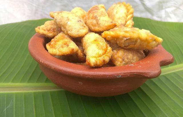 - മാവ് പകുതിയായി മടക്കി വശങ്ങൾ കൈകൊണ്ടോ ഫോർക്ക് (Fork) ഉപയോഗിച്ചോ നന്നായി അമർത്തുക. വശങ്ങൾ ഡിസൈൻ ചെയ്യണമെങ്കിൽ മടക്കി ഒട്ടിക്കാവുന്നതാണ്.
