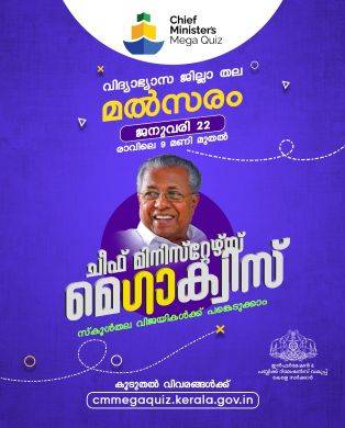 കേരളത്തിന്റെ സാമൂഹിക പുരോഗമന ചരിത്രം അടിസ്ഥാനമാക്കി സംസ്ഥാന സര്ക്കാര് സംഘടിപ്പിക്കുന്ന ചീഫ് മിനിസ്റ്റേഴ്സ് മെഗാ ക്വിസ് മലപ്പുറം ജില്ലാതല മത്സരം നാളെ (വെള്ളി) മേല്മുറി മഅ്ദിന് അക്കാദമി ഓഡിറ്റോറിയത്തില് നടക്കും. സ്കൂള്തല മത്സരം രാവിലെ 10നും കോളെജ് തല മത്സരം ഉച്ചയ്ക്ക് 2.30നുമാണ് നടക്കുന്നത്. സ്കൂള്തല മത്സരങ്ങള്ക്കുള്ള രജിസ്ട്രേഷന് രാവിലെ ഒന്പതിനും കോളെജുതല മത്സരങ്ങള്ക്കുള്ള രജിസ്ട്രേഷന് രാവിലെ 11.30നും ആരംഭിക്കും. സ്കൂള്തല വിദ്യാഭ്യാസ ജില്ലാ മത്സരത്തില് നിന്ന് തെരഞ്ഞെടുക്കപ്പെട്ട 80 വിദ്യാര്ഥികളും കോളെജുകളിലെ മത്സരങ്ങളില് യോഗ്യത നേടിയ 300 വിദ്യാര്ഥികളുമാണ് ജില്ലാതലത്തില് മത്സരിക്കുന്നത്. മത്സരത്തിനെത്തുന്ന വിദ്യാര്ഥികള് സ്ഥാപനത്തിന്റെ ഐ.ഡി.കാര്ഡും സ്ഥാപന മേധാവിയുടെ സാക്ഷ്യപത്രവും കൊണ്ടുവരണം.