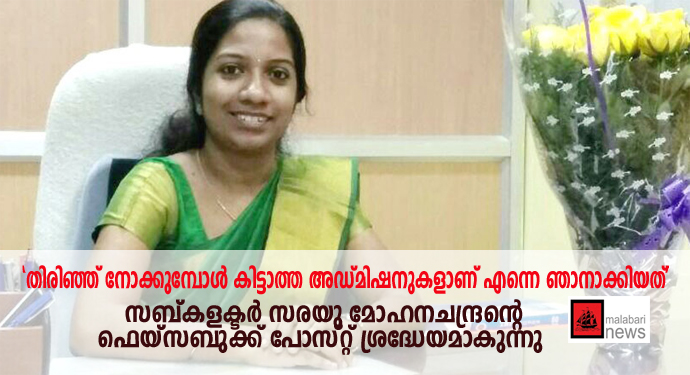 സര്ക്കാര് എയിഡഡ് വിദ്യാലയങ്ങളെ ഒഴിവാക്കി ഇപ്പോഴും അണ്എയിഡഡ് വിദ്യാലയങ്ങള് തേടിപ്പോകുന്ന രക്ഷിതാക്കളോട് അഡിമിഷന് കാലത്ത് സ്വന്തം അനുഭവങ്ങള് പറഞ്ഞുകൊണ്ട് തമിഴ്നാട്ടില് സബ്കളകടറായ സരയു മോഹനചന്ദ്രന്റെ ഫെയ്സബുക്ക് പോസ്റ്റ് ഏറെ ശ്രദ്ധേയമാകുന്നു.