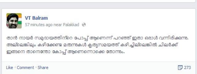 “താന് നായര് സമുദായത്തിന്റെ പോപ്പാണെന്ന് പറഞ്ഞ് ഇതാ ഒരാള് വന്നിരിക്കുന്നു. അല്ലെങ്കിലും കഴിക്കേണ്ട മരുന്നുകള് കൃത്യ സമയത്ത് കഴിച്ചില്ലെങ്കില് ചിലര്ക്ക് ഇങ്ങനെ താനെന്തോ കോപ്പ് ആണെന്നൊക്കെ തോന്നും.” തന്റെ ഫേസ് ബുക്ക് വാളിലാണ് എംഎല്എ എന്എസ്എസ് ജനറല് സെക്രട്ടറിയെ കളിയാക്കുന്ന തരത്തില് ഇത്തരത്തില് പോസ്റ്റിട്ടിരിക്കുന്നത്.