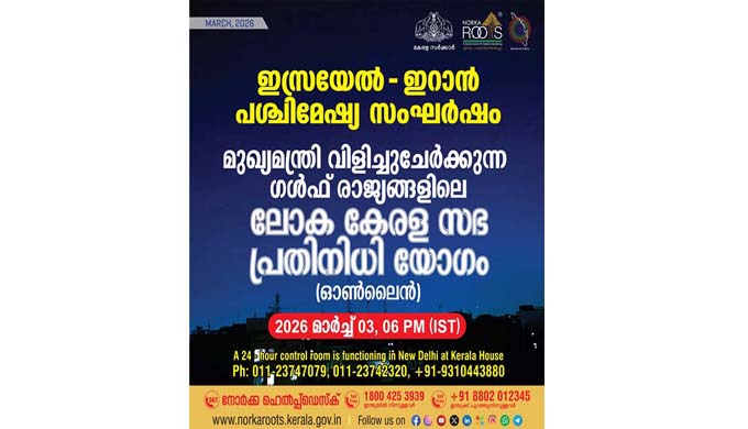 ഇറാന് ഇസ്രായേല് സംഘര്ഷം പശ്ചിമേഷ്യന് മേഖലയിലാകെ തുടരുന്ന പശ്ചാത്തലത്തിൽ മുഖ്യമന്ത്രി പിണറായി വിജയൻ പങ്കെടുക്കുന്ന ഗൾഫ് രാജ്യങ്ങളിലെ ലോക കേരള സഭ പ്രതിനിധികളുടെ ഓൺലൈൻ യോഗം 2026 മാർച്ച് 3, ഇന്ത്യൻ സമയം വൈകിട്ട് ആറിന് ചേരും.