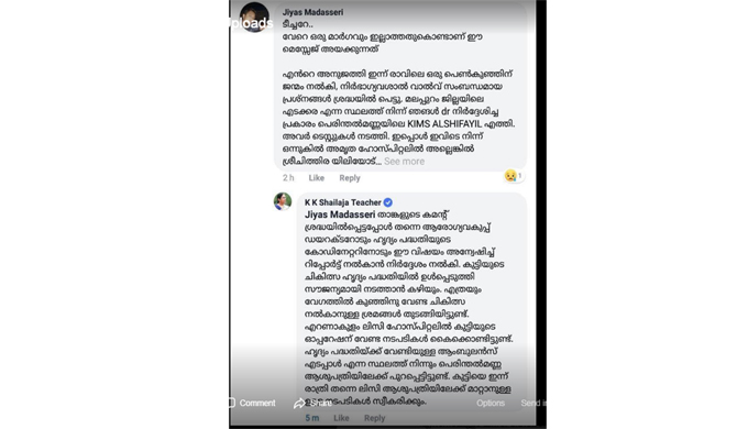 പെരിന്തല്മണ്ണയില് നിന്ന് നവജാത ശിശുവിനെ വിദഗ്ധ ചികിത്സയ്ക്കുവേണ്ടി എറണാകുളത്തെത്തിച്ചത് രണ്ട് മണിക്കൂര് കൊണ്ടാണ്. ആരോഗ്യമന്ത്രി കെകെ ഷൈലജയുടെ ഫെയ്സ്ബുക്ക് പേജില് വന്ന കമന്റിനുമേലെടുത്ത പെട്ടന്നുള്ള നടപടികളാണ് കുഞ്ഞിന് തുണയായത്. രക്താര്ബുദത്തോട് പൊരുതി എസ്എസ്എല്സി പരീക്ഷയില് മികച്ച വിജയം കൈവരിച്ച വിദ്യാര്ത്ഥിയെ അനുമോദിച്ച് മന്ത്രി ഫെയ്സ്ബുക്കില് പോസ്റ്റ് ചെയ്ത കുറിപ്പിന് താഴെ ജിയാസ് മടശേരി എന്ന യുവാവാണ് തന്റെ സഹോദരിയുടെ കുഞ്ഞിനായി സഹായം അഭ്യര്ത്ഥിച്ചത്.