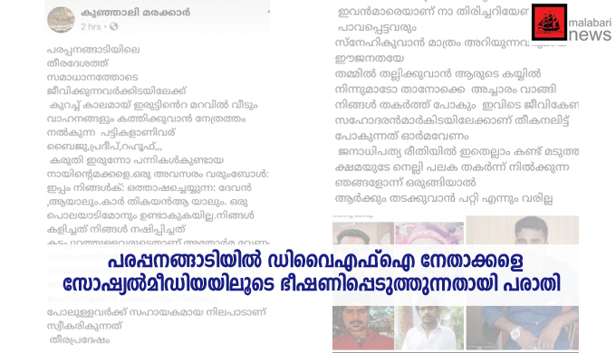 ഫേസ്ബുക്കിലെ കുഞ്ഞാലിമരക്കാര്, സുല്ത്താന് ഷാ എന്നീ അക്കൗണ്ടുകള് വഴിയാണ് ഭീഷണി ഉയര്ന്നിരിക്കുന്നത്. ഡിവൈഎഫ്ഐ ജില്ലാ കമ്മിറ്റി അംഗം ബൈജു, റൗഫ്,പ്രദീപ്, റഹീം എന്നിവര്ക്ക് നേരെയാണ് ഭീഷണി ഉയര്ന്നിരിക്കുന്നത്. പോസ്റ്റില് പ്രാദേശിക സിപിഎം നേതാക്കള്ക്ക് നേരെയും അസഭ്യവര്ഷമുണ്ട്.