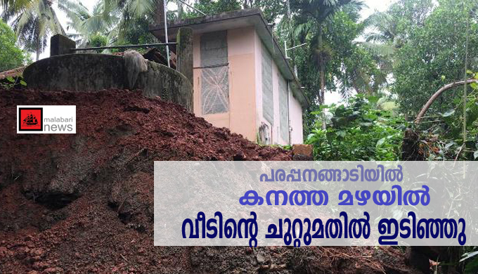മതില് ഇടിഞ്ഞതോടെ മുന്ഭാഗത്തെ മണ്ണ് ഒലിച്ചു വീടിനു ഭീഷണി ആകുമോ എന്ന ആശങ്കയിലാണ് ഈ നിര്ധന കുടുംബം.