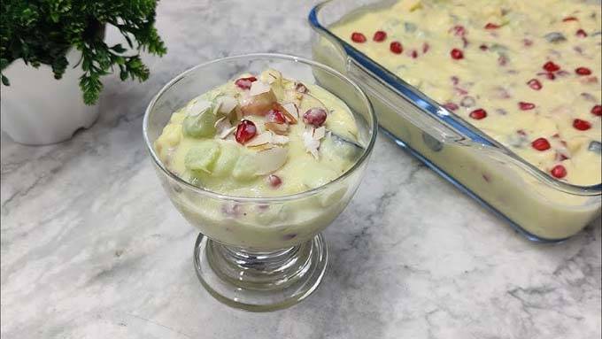 - പഴങ്ങൾ ചേർക്കുക: കസ്റ്റാർഡ് പൂർണ്ണമായും തണുത്തതിനുശേഷം (റൂം ടെമ്പറേച്ചറിൽ വന്നാൽ) അരിഞ്ഞു വെച്ചിരിക്കുന്ന പഴങ്ങൾ ചേർത്ത് നന്നായി യോജിപ്പിക്കുക.