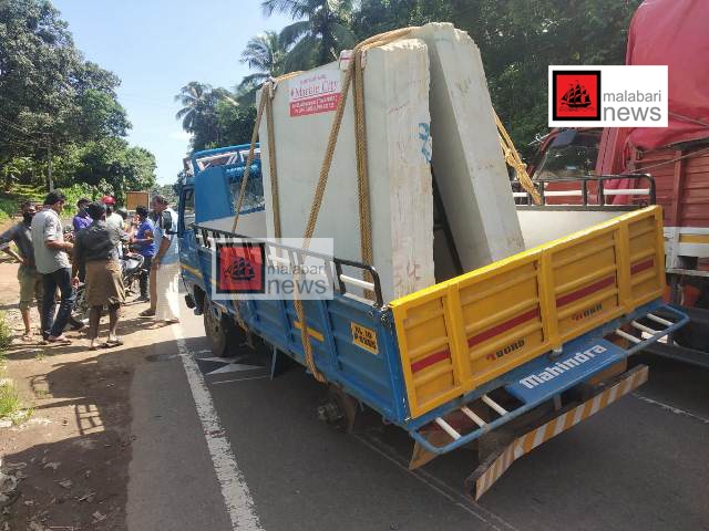 വാഹനം മറിയാത്തത് മൂലം മുന്സീറ്റില് ഉണ്ടായിരുന്ന ഡ്രൈവറും ക്ലീനറും പരിക്കേല്ക്കാതെ രക്ഷപ്പെട്ടു. ദേശീയപാത കക്കാട് കൂരിയാട് പാലത്തില് വെച്ച് ഇന്ന് ഉച്ചയ്ക്ക് 2 30 നായിരുന്നു അപകടം.