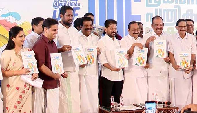 പ്രകടന പത്രിക പുറത്തിറക്കി യു.ഡി.എഫ്. തെലങ്കാന മുഖ്യമന്ത്രി രേവന്ത് റെഡ്ഡി പ്രതിപക്ഷ നേതാവ് വി.ഡി.സതീശന് നല്കിയാണ് പ്രകടന പത്രിക പ്രകാശനം ചെയ്തത്. രാഹുല് ഗാന്ധി പ്രഖ്യാപിച്ച അഞ്ച് ഇന ഗ്യാരണ്ടികള്ക്കൊപ്പമാണ് പത്രിക. കെഎസ്ആര്ടിസി ബസുകളില് സ്ത്രീകള്ക്ക് സൗജന്യ യാത്ര, ക്ഷേമ പെന്ഷന് പ്രതിമാസം 3,000 രൂപയായി ഉയര്ത്തല്, കോളേജ് വിദ്യാര്ത്ഥിനികള്ക്ക് പ്രതിമാസം 1,000 രൂപ സഹായം എന്നിവയാണ് പ്രകടന പത്രികയില് പ്രധാനമായുള്ളത്. കേരളത്തിലെ ഓരോ കുടുംബത്തിനും 25 ലക്ഷം രൂപയുടെ ഇന്ഷുറന്സ് പദ്ധതി നല്കുമെന്നും ചെറുകിട ബിസിനസുകള്ക്ക് 5 ലക്ഷം രൂപയുടെ പലിശരഹിത വായ്പ ലഭിക്കുമെന്നും പ്രകടന പത്രികയില് പറുന്നു.