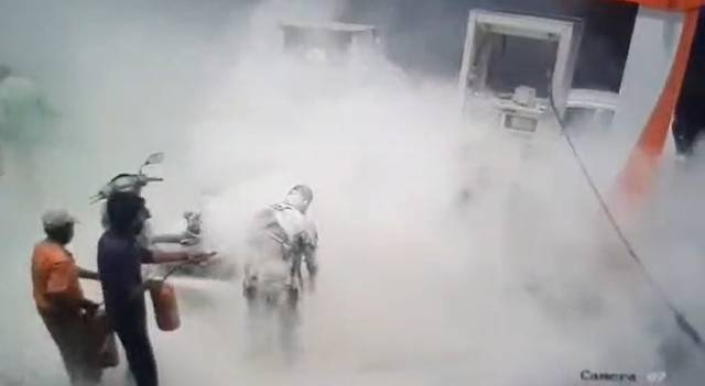 നിമിഷനേരം കൊണ്ട് ടാങ്കിൽ നിന്ന് തീ ആളിപ്പടരുകയും പെട്രോൾ പമ്പിന്റെ നോസിലിലേക്ക് വ്യാപിക്കുകയും ചെയ്തു. പെട്രോൾ ടാങ്കിൽ നിന്നും കത്തുന്ന ഇന്ധനം തെറിച്ച് പ്രതികളായ രണ്ട് യുവാക്കളുടെ ശരീരത്തിലും വീണു. തീ പടർന്നതോടെ പമ്പ് ജീവനക്കാരനും മറ്റുള്ളവരും ആദ്യം ഓടിമാറിയെങ്കിലും ഉടൻ തന്നെ ജീവനക്കാരൻ തിരികെയെത്തി ഇന്ധന ഹോസ് മാറ്റുകയും മെയിൻ സപ്ലൈ ഓഫ് ചെയ്യുകയും ചെയ്തു. തുടർന്ന് ഫയർ എക്സ്റ്റിംഗുഷർ ഉപയോഗിച്ച് തീ അണച്ചതോടെയാണ് വൻ അപകടം ഒഴിവായത്.